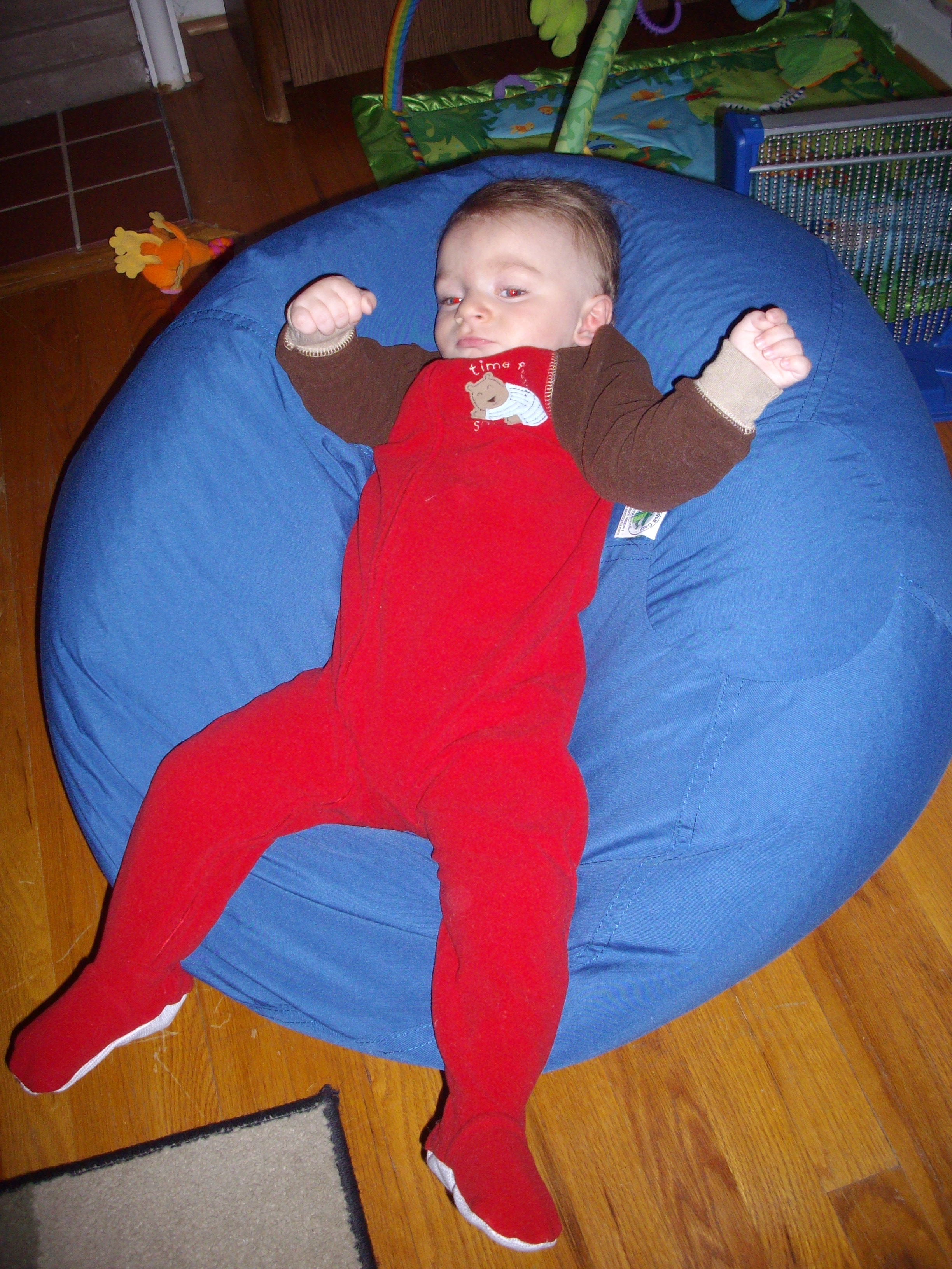 We got him a bean bag chair, suggested by another family with a lissencephaly child. Because he can’t sit up on his own yet, the bean bag chair is a good alternative to the mat and the high chair.