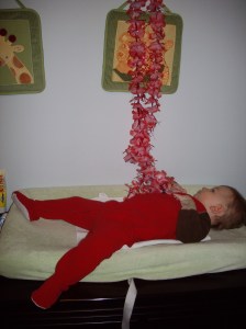 We hung a red lei above the changing table at the suggestion of the Cincy Association for the Blind. It helps his vision because it gives him something to look at when we change his diaper. It’s also easy for him to see because he’s familiar with it.