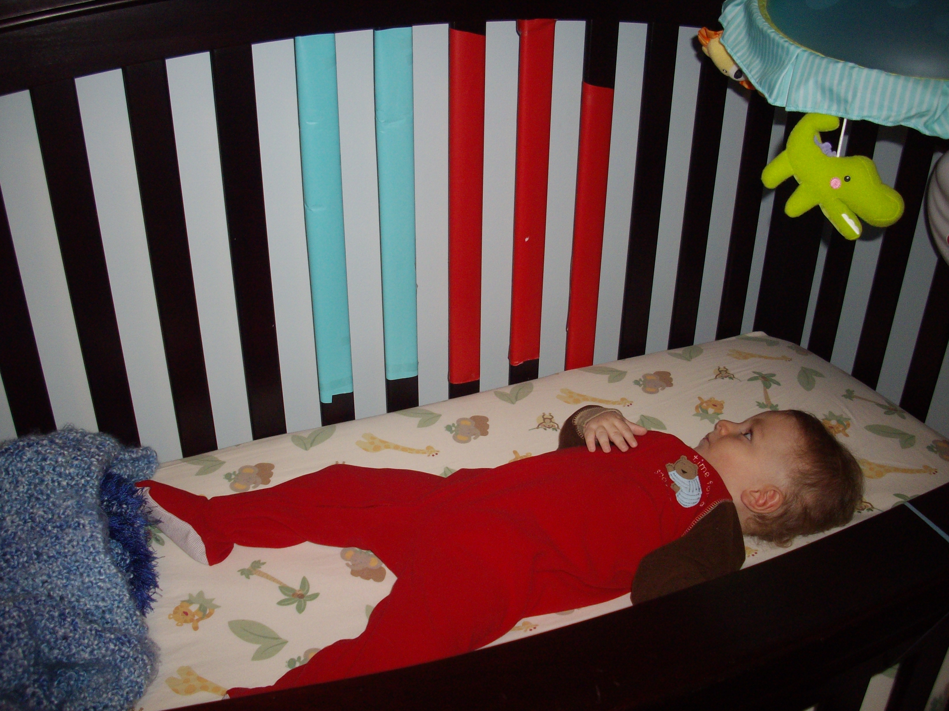 I wrapped red and blue wrapping paper around some of the bars of his crib. Because he sees bright, solid-colored objects best, I thought I’d give him something to look at while in his crib. I might jazz it up with some sparkly wrapping paper.