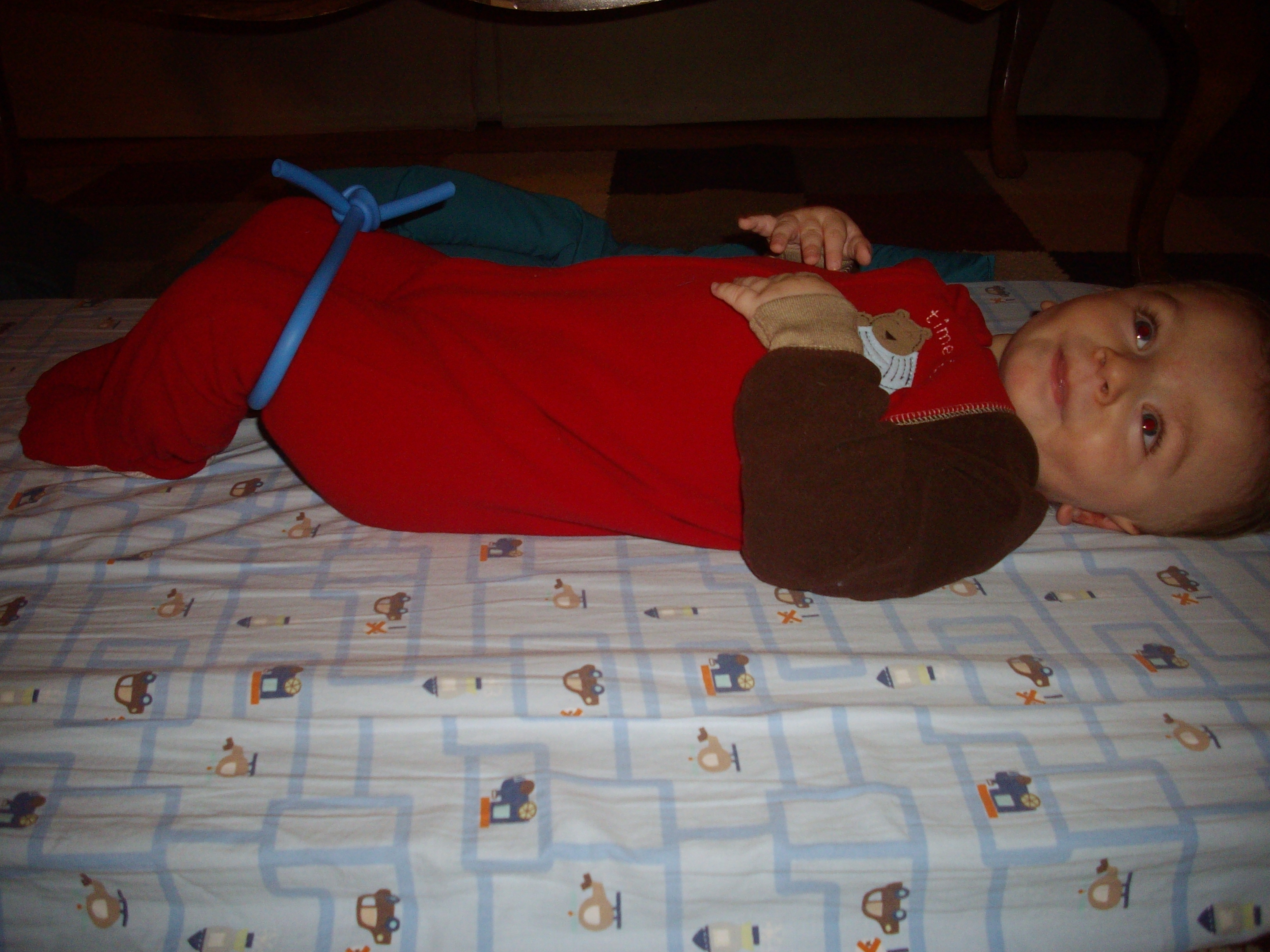 The blue thing is an elastic strap we put around his legs for a few minutes a day. Due to his low muscle tone, his legs flop out in an unnatural way. The elastic strap helps hold his legs together.
