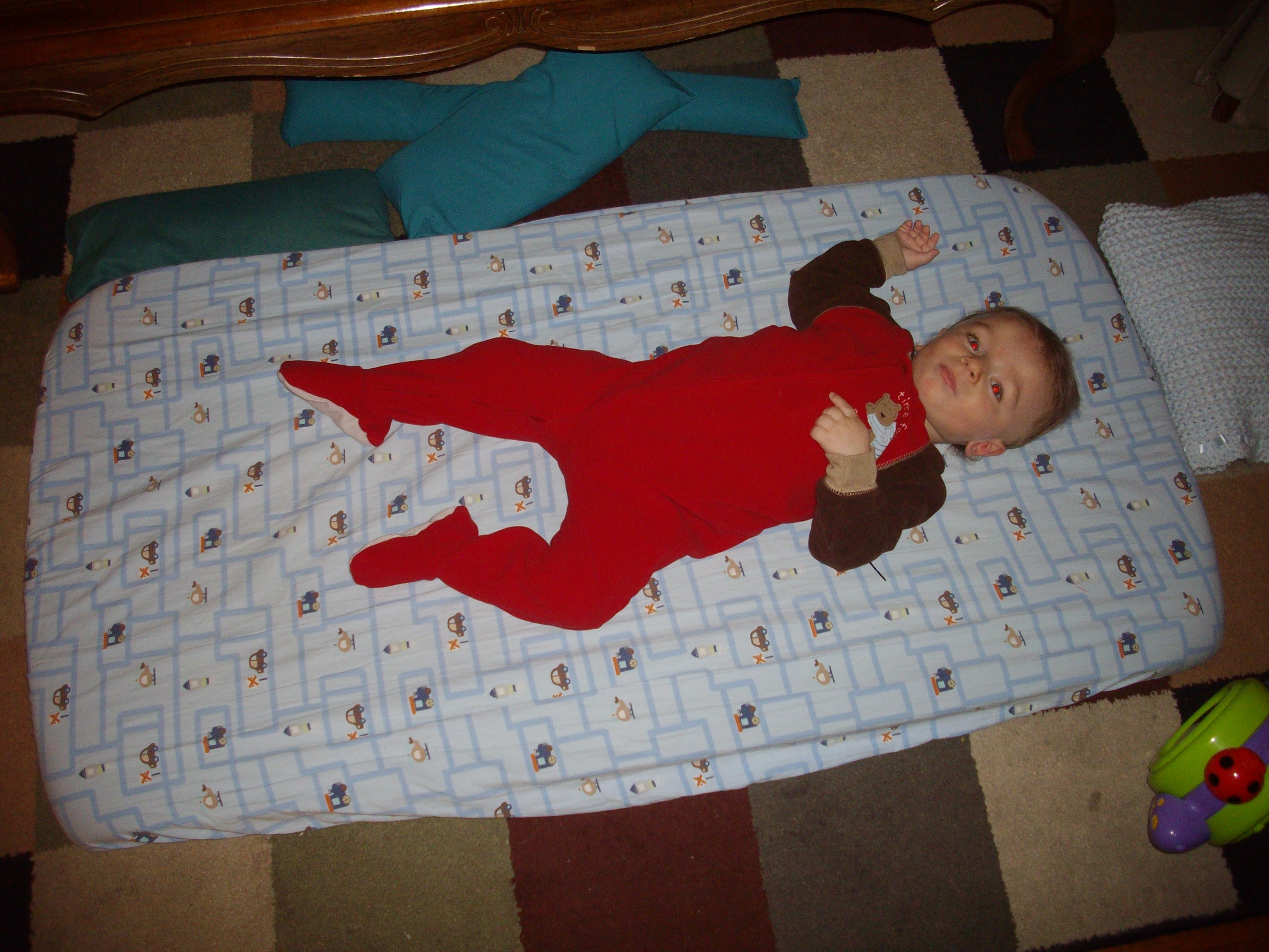 This is his mat. It’s a piece of thick foam from Joann Fabric with a crib sheet over it. The mat lies in the living room between the TV and the coffee table. My dad thought of the mat. It’s perfect for playtime and naps. We do a lot on the mat. It’s big enough for Jackson and an adult to lay on or for Jackson and two adults to sit on.
