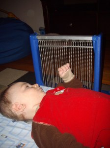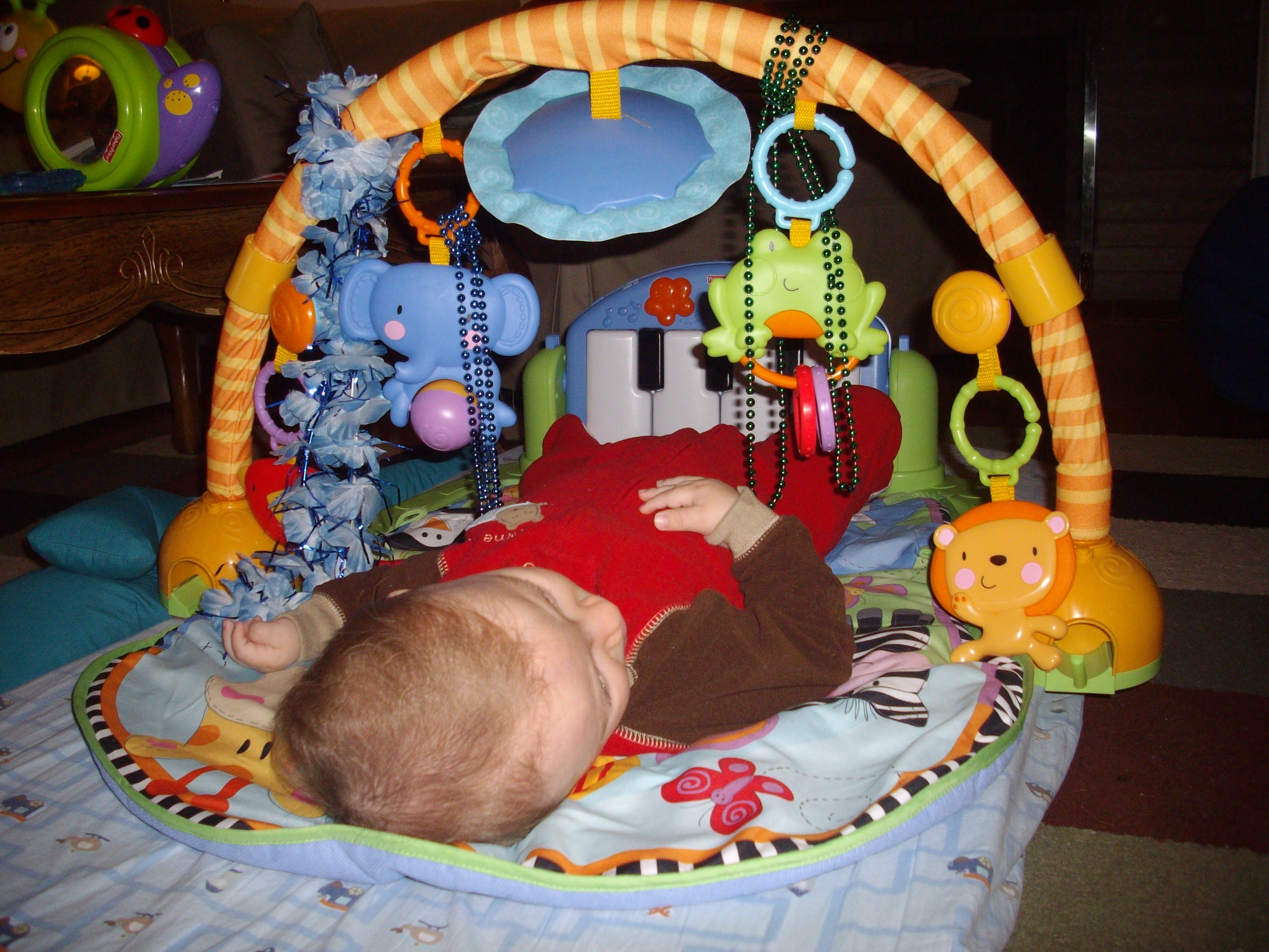 Jackson can entertain himself in his playland. We modified it with help from the Cincy Association for the Blind and Visually Impaired to make it easy for him to bat at objects with his hands. We hung green and blue beads and a blue lei. The keyboard in the background makes music when he kicks it. We love to watch him bat at the hanging toys and kick his feet on the keys.