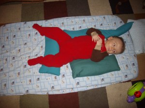 This is Jackson on his mat surrounded by homemade rice bags, which help with positioning. They also help keep his arms and legs more centered. It’s an important developmental step to come to center, which we never realized until his diagnosis.