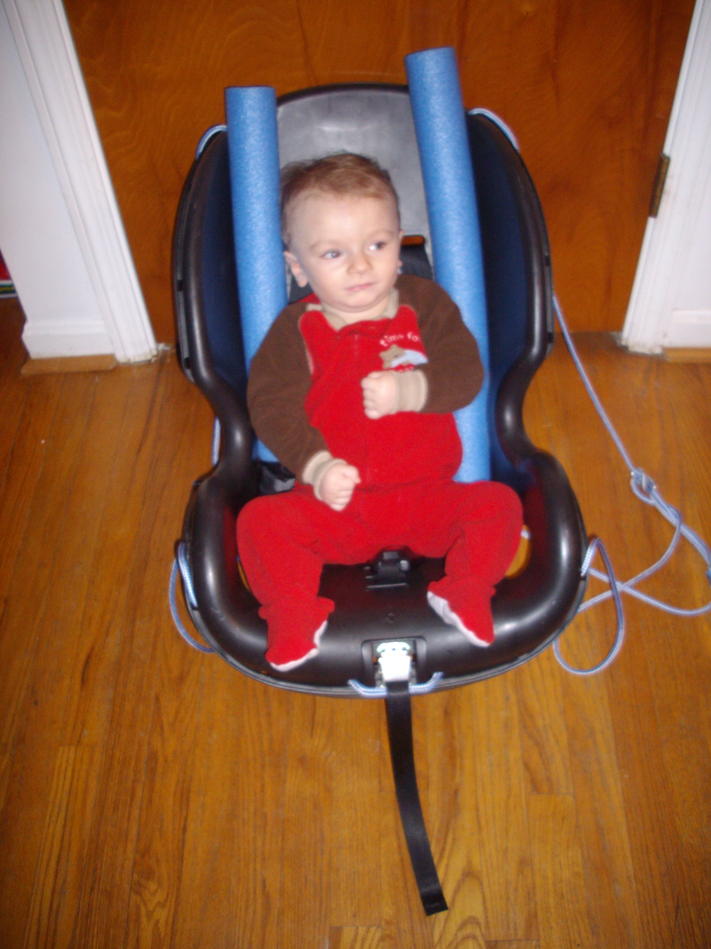 Jackson’s Nonno (grandpa) made him this swing. He can’t be in a normal swing because he can’t sit up on his own yet. My dad took an old car seat, attached rope to it and hooked it to the ceiling. Voila, Jackson’s swing. He LOVES to swing and he’ll fit in this for the next few years. Swimming pool noodles are on either side of him to provide additional support.
