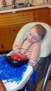 As we’ve said in other posts, the big red button is a switch. It makes noise when you press the button. Jackson is GREAT at hitting the switch with his hands and feet. This is another cause and effect toy.