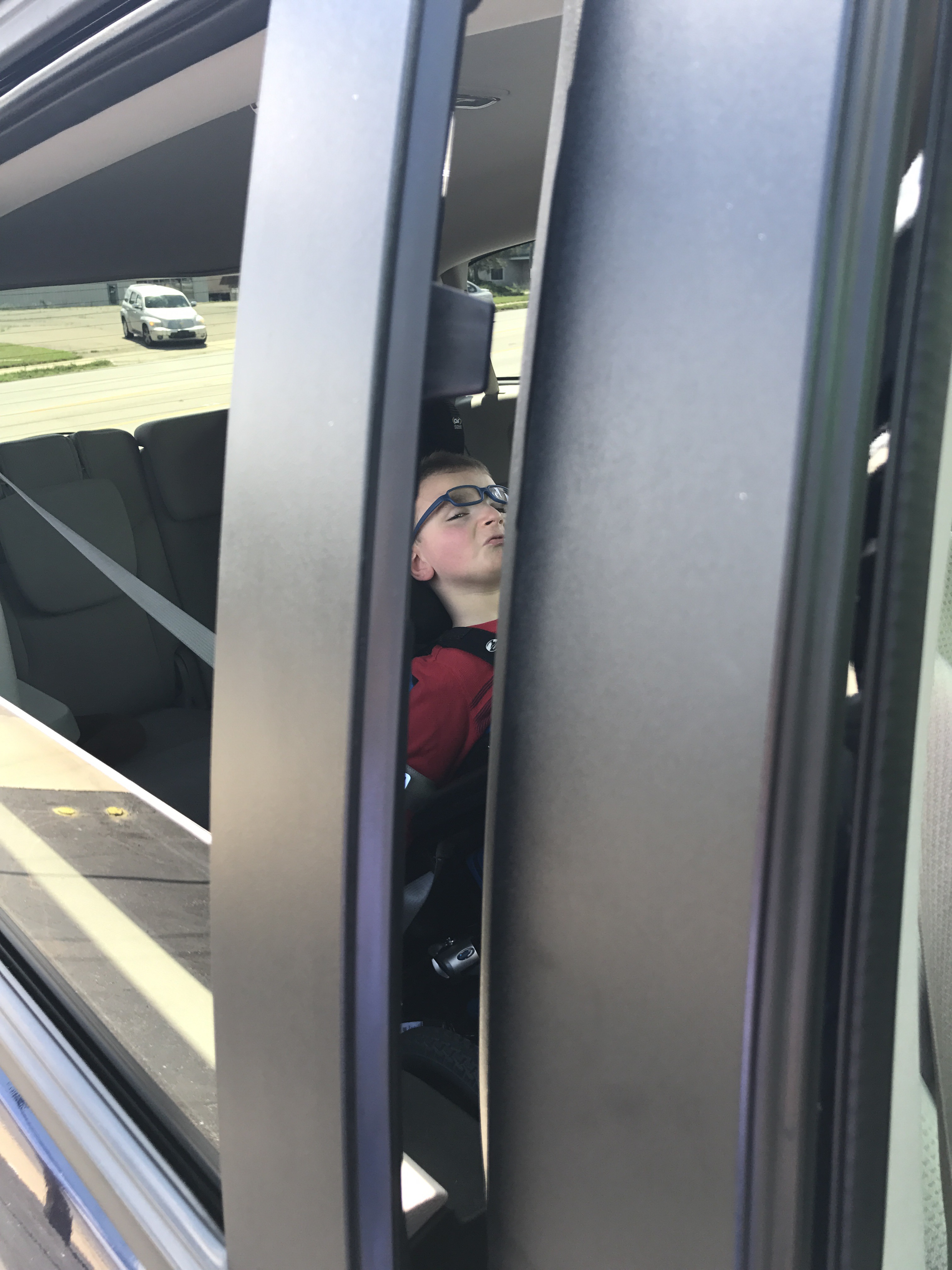 Everything was going great with the van until I took the kids by myself to a store last week. When I slid the door open to get the ramp out THE TOP HINGE OF THE DOOR CAME OFF!!! I was literally holding the sliding door up with my own two hands. I couldn’t let the door go because it would fall and break the middle and bottom hinges. Both kids were thankfully locked in their seats and could not get out (we were parked next to a busy street; lots of cars were driving by and Luca tends to run around like crazy).