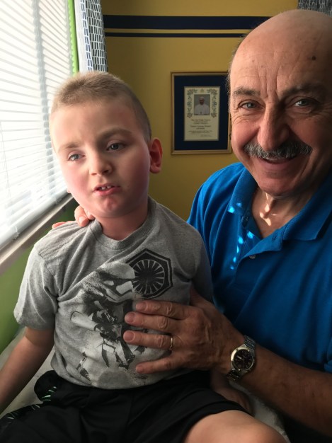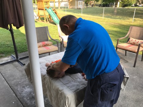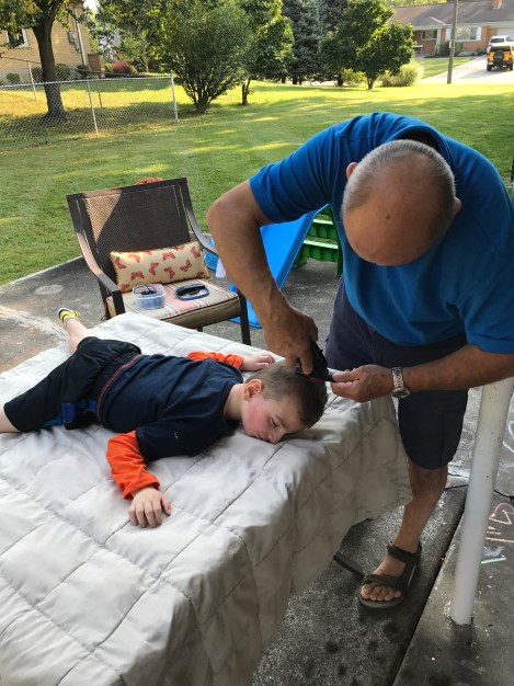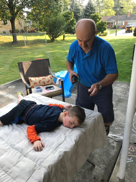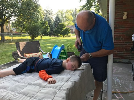 My dad has been cutting Jackson’s hair for the past few years. We usually take the headrest off the wheelchair and someone holds his head and trunk while my dad cuts his hair.