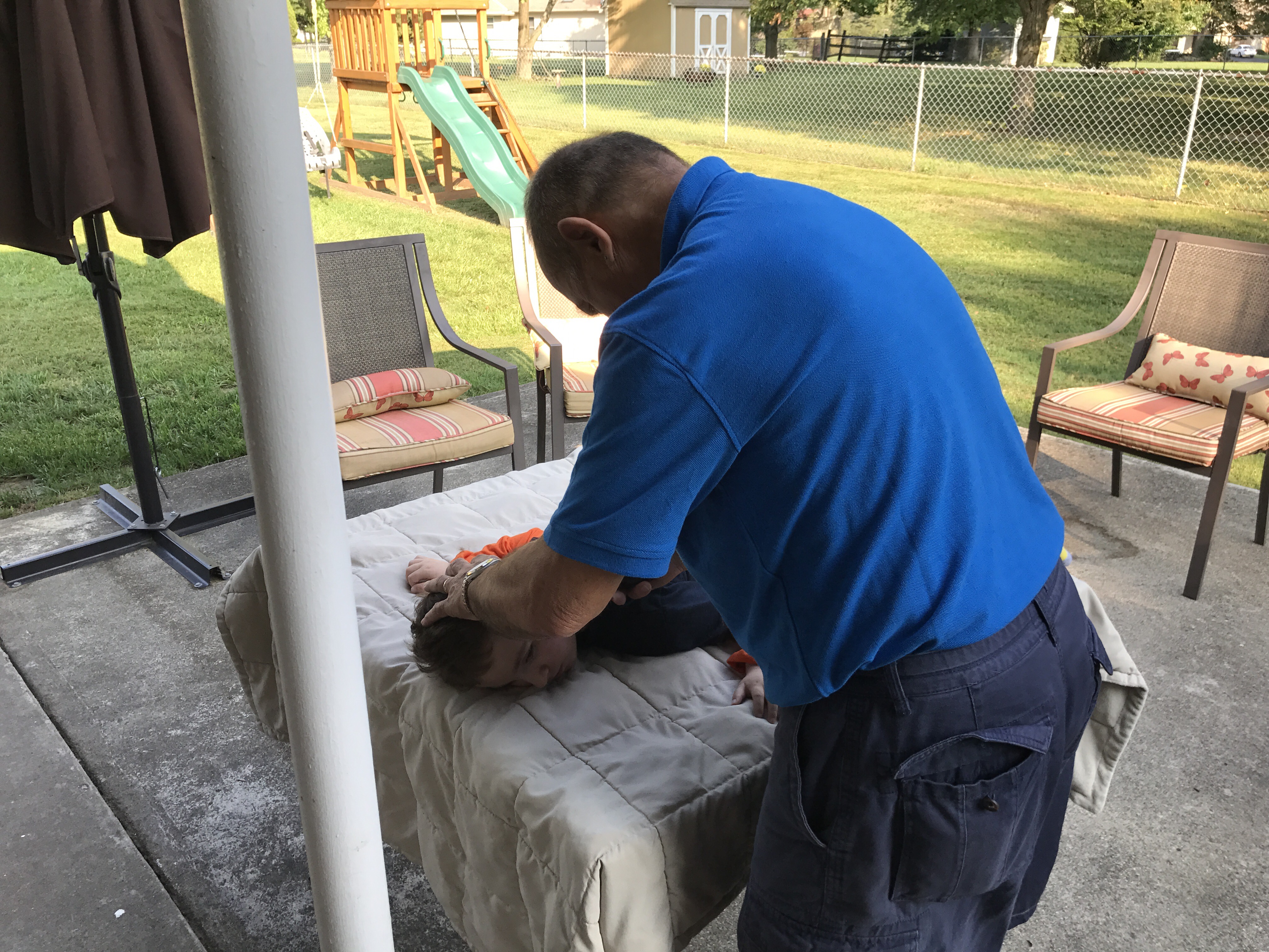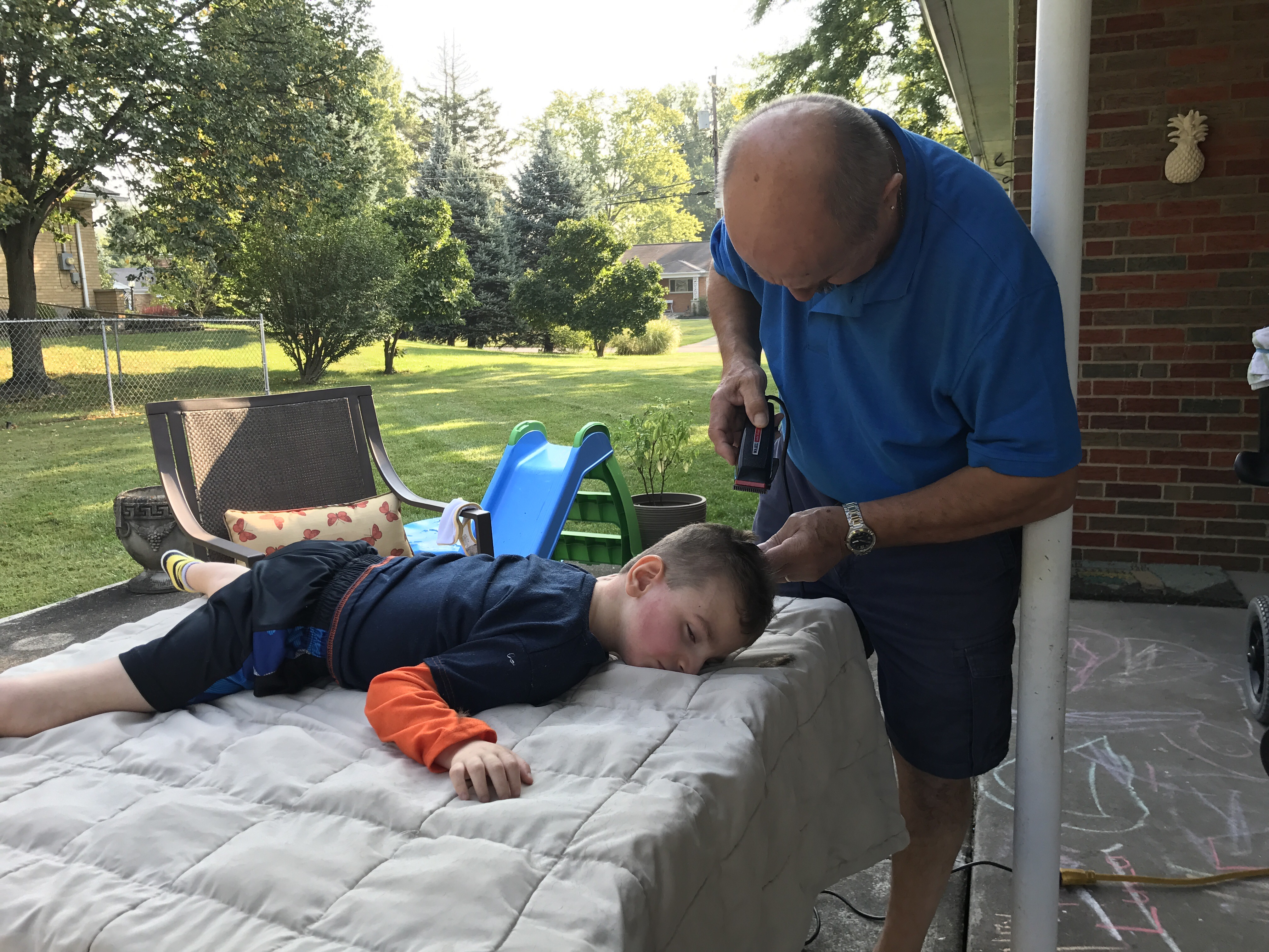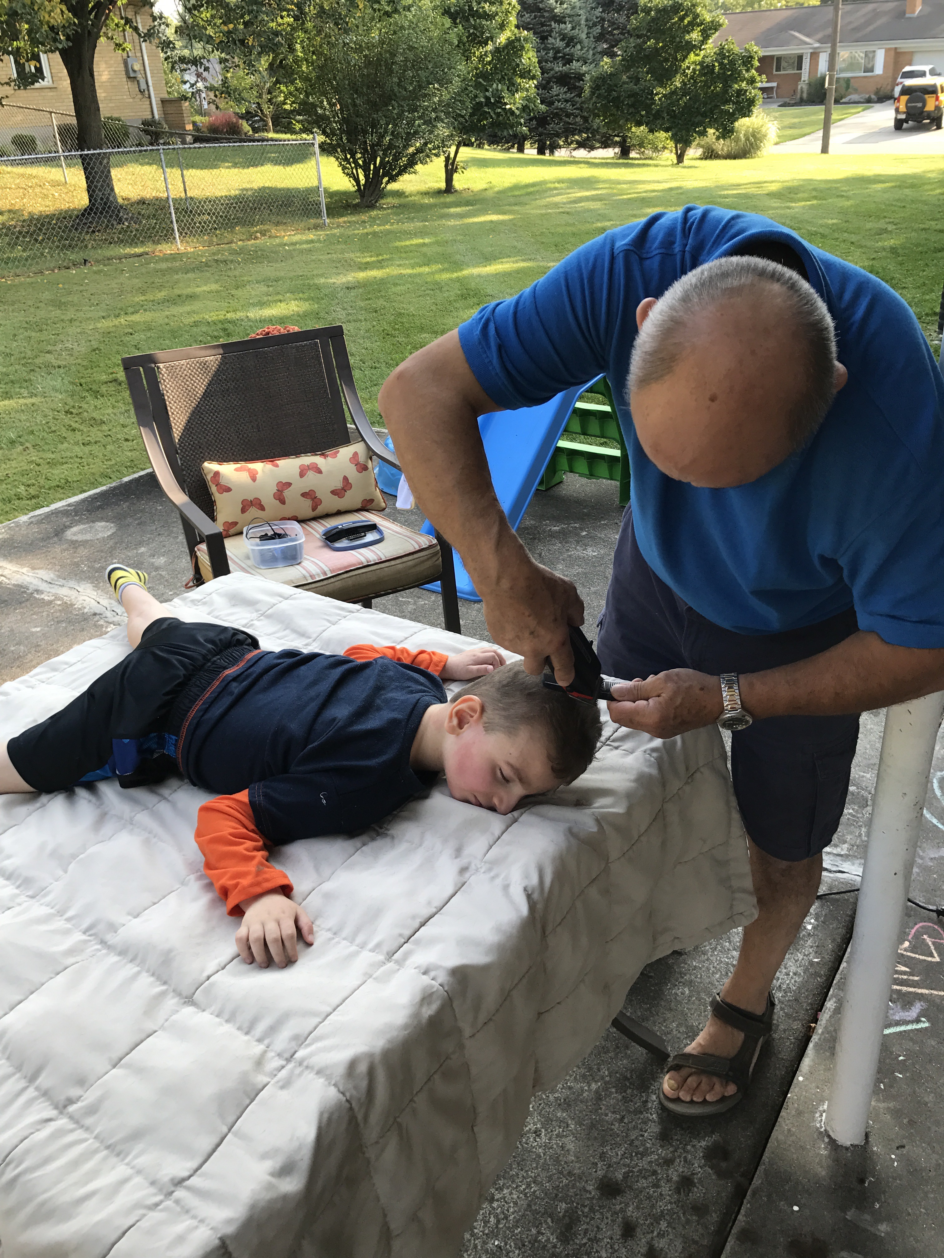 I asked my dad to come over today and give Jackson’s hair a trim. After my dad got to my house he told me he was going to cut Jackson’s hair on the table outside. I had no idea what he was talking about but I said, “Sure. Whatever you want to do.” As my dad took Jackson outside I received a phone call and became distracted from the haircut. A few minutes later I walked outside and found this: