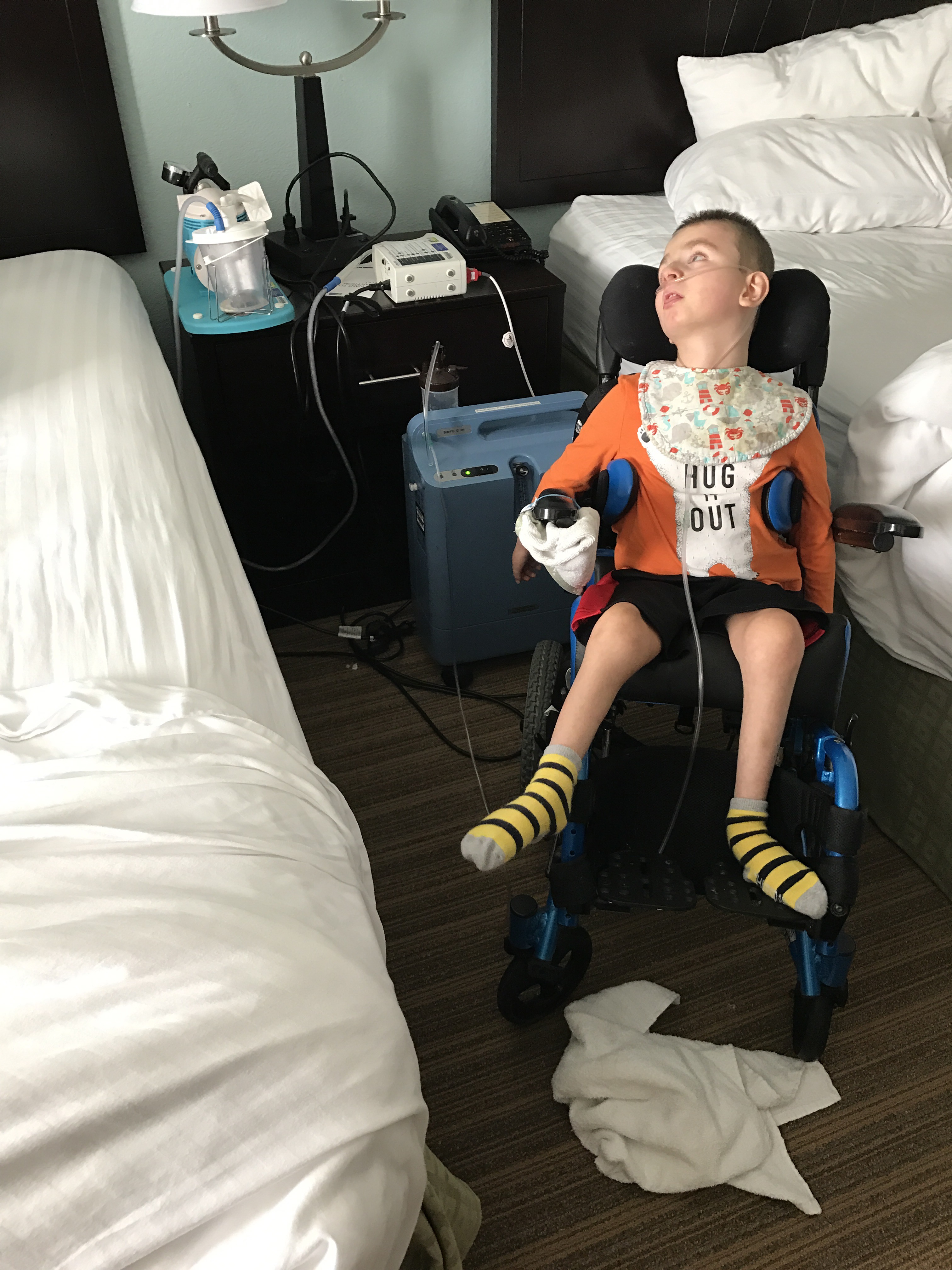 Above is Jackson in the hotel room hooked up to his pulse ox machine and getting extra oxygen. The suction machine is on the night stand; we use it to suck mucous out of his mouth and nose because he can’t clear it himself.