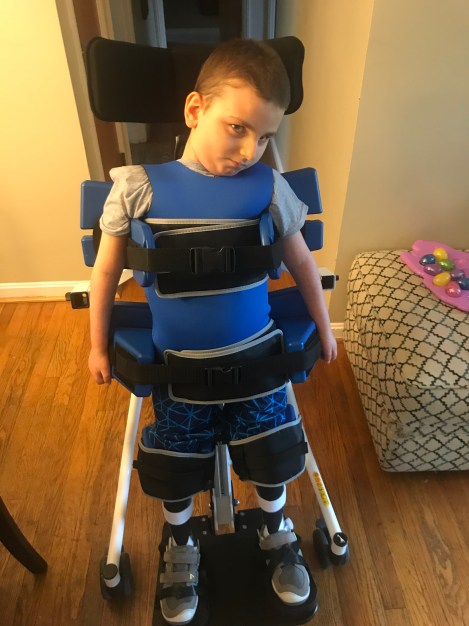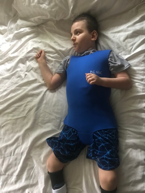 Jackson’s spine has a slight curve in it and is being monitored by his orthopedic doctor. To give him more support when he is in the stander and in a sitting position, Jackson just got a Benik best. The Benik vest is made of wetsuit-like material and provides support to his trunk, which, I hope, will help keep his spine in line.