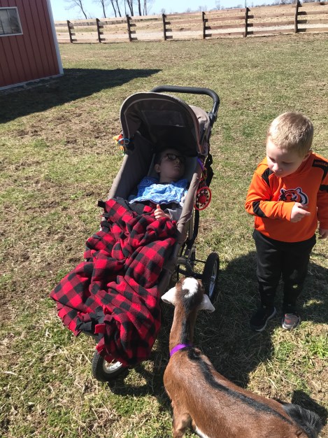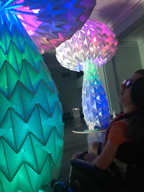 He also managed to get out of the house a few times to see family and friends. We visited my friend Jayne at her farm and played with her animals. Jackson swung on the swing that Santa brought him for Christmas. We went to see the Burning Man Exhibit at the Cincinnati Art Museum (This Exhibit was perfect for Jackson, who sees best when he looks at solid, bright colors).