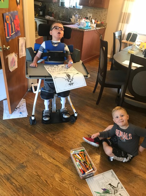 Jackson was finally cleared to start standing again in March. He did not stand for almost a year due to his hips being out of socket. We try to get him in the stander 4-5 days a week for an hour each time. Standing helps improve his overall health and strengthens his joints and bones.