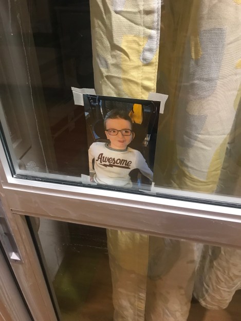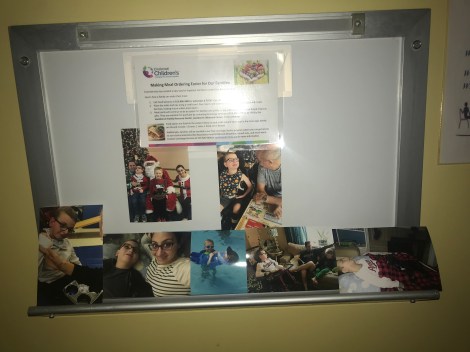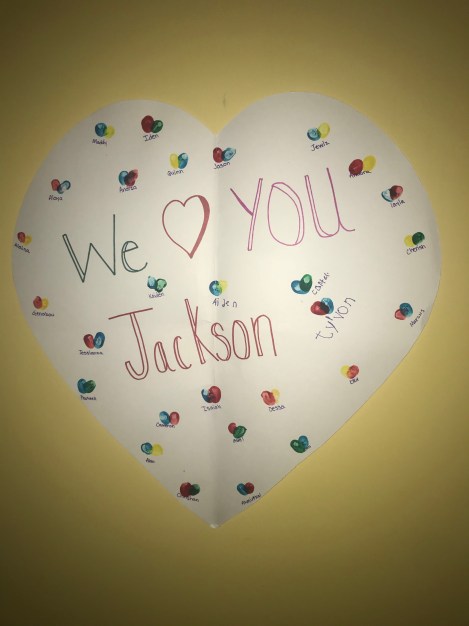 We decorated his hospital room yesterday to give it a little pizzazz. I hung up a get well card from Jackson’s classmates and we developed pictures of a happy Jackson and put them around the room.