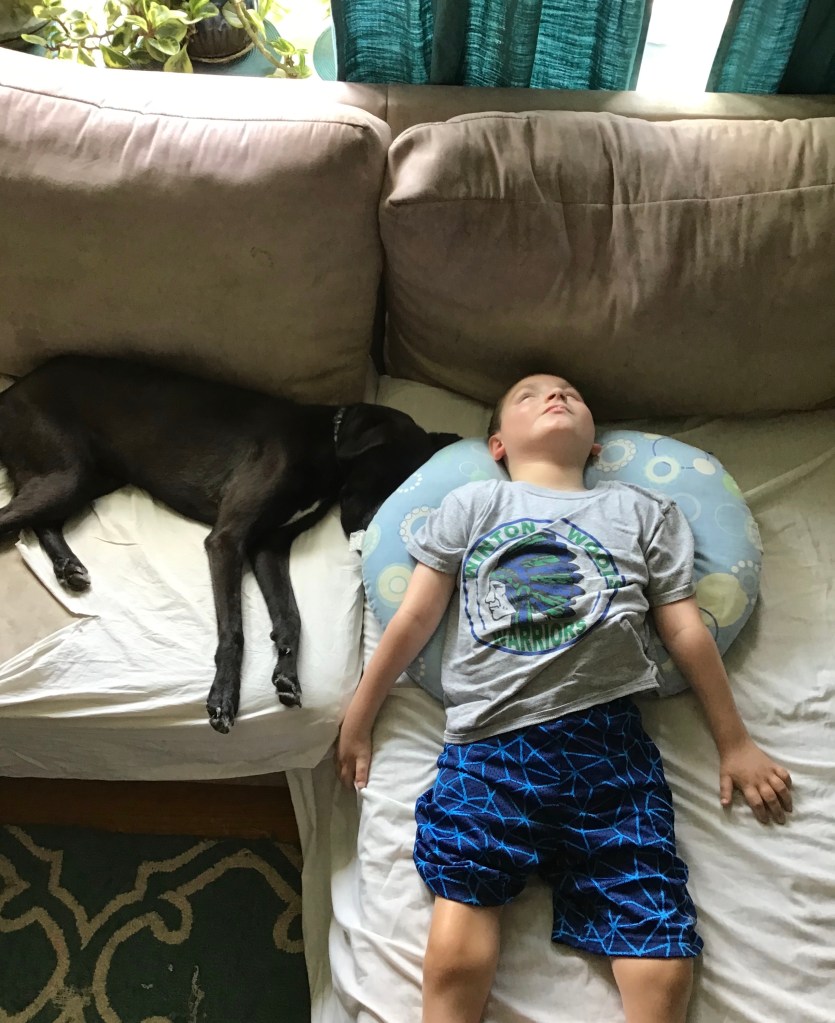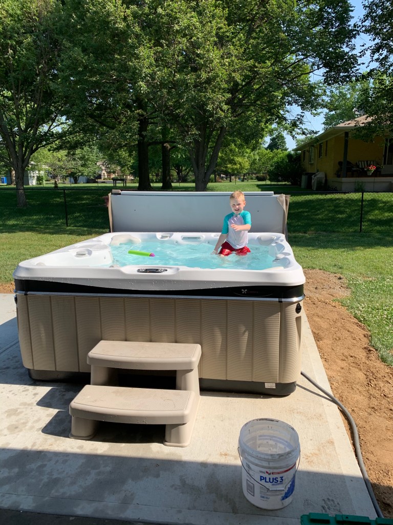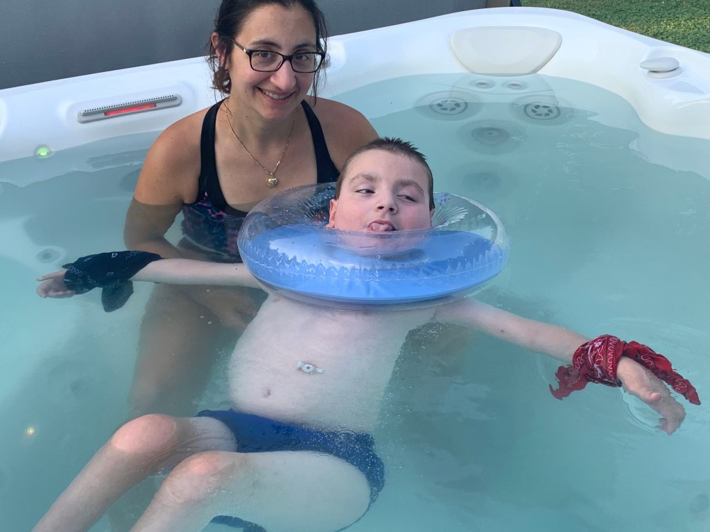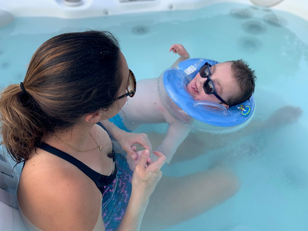 Jackson’s wish was delivered a few weeks ago and the timing couldn’t be more perfect. We try to get him in the hot tub twice a week. It is so easy to have this at our house rather than take him somewhere. For example, when we take him to the indoor heated pool at the YMCA, we have to bring the wheelchair, jogging stroller, diaper bag, and swim gear. It takes forever to get ready and there’s not a good place to change him when we are done swimming. Whereas, we are already equipped to handle Jackson at our house. We were also trying to get Jackson into another aqua therapy session but Covid-19 hit; so this is a good substitute.